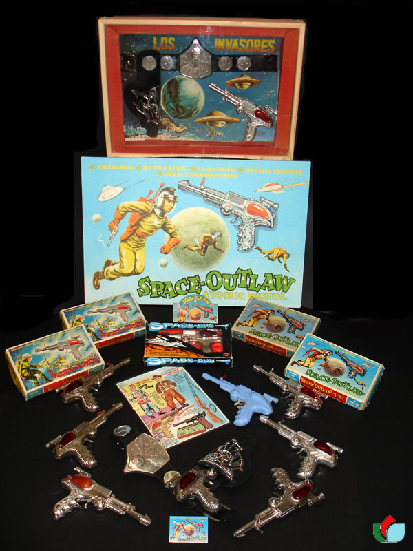 Space Outlaw Atomic Pistol picture / mural LIMITED EDITION HAND SCREENED PICTURE OF A ATOMIC PISTOL THE CANVAS HAS ON THE TOP SMOKING ***REPEATING *** FLASHING*** RECORD BARREL THEN SPACE OUTLAW - ATOMIC PISTOL ON THE PISTOL SPACE OUTLAW IS WRITTEN THERE WERE LIMITED TO ONLY 50 EACH OF WHICH 1/2 STAYED OVERSEAS ESPECIALLY IN JAPAN THIS CANVAS WAS DONE BY J. & L. KENDALL LTD. ENGLAND IN MCMLII